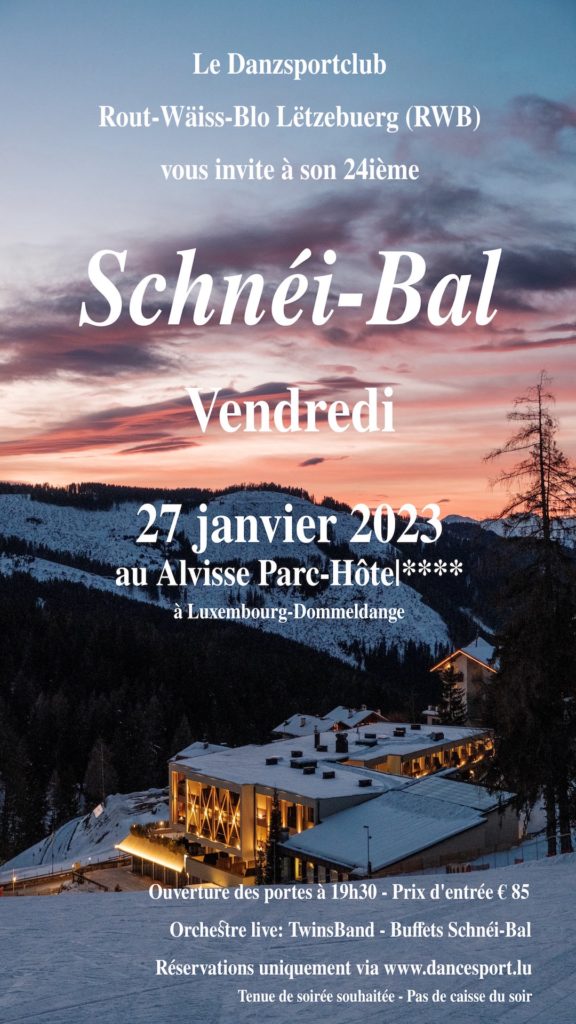 Sort events by class: Beginner Classes Bronze Classes Silver Classes Gold Classes « All Events This event has passed. RWB Schnéibal 27/01/2023 @ 19:30 - 23:30 €85 « Gold Class Beginner class » Add to calendar Google Calendar iCalendar Outlook 365 Outlook Live Details Date: 27/01/2023 Time: 19:30 - 23:30 Cost: €85 Event Category: External events Website: www.dancesport.lu Organizer RWB Danzsportclub View Organizer Website Venue Parc Hotel Alvisse Alvisse Parc Hotel, Route d'Echternach Luxembourg, 1453 Luxembourg + Google Map